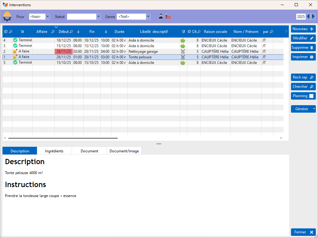 In the lower part the interventions carried out are displayed, which are pre-selected when their status is completed. You can select them for billing, or not, using the checkbox in column S. You can use the context menu of the table at the bottom to add or modify interventions for the selected client.