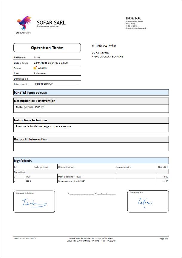 • Produce an intervention sheet which you can give to your customer when the intervention is due (so that he can validate his request), or done (so that he can validate the intervention), depending on your management process. You can have the technician responsible for the intervention and/or the customer sign it, on your computer, or on mobile or smartphone (via l'extension INTERWEB).