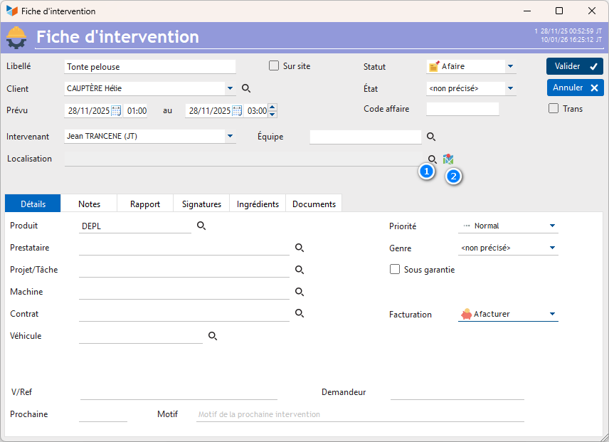 Finally, you can indicate the location of the intervention, when it is not at the customer's main address.