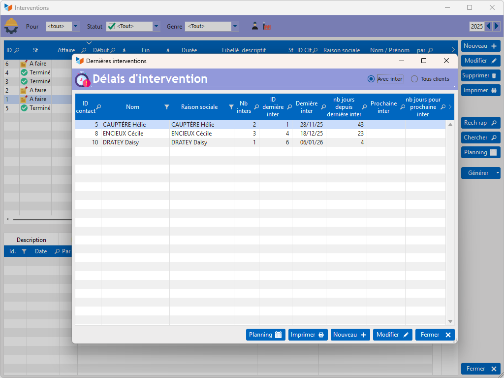 The screen displays at the top all the customers who have been the subject of at least one intervention during the period considered.