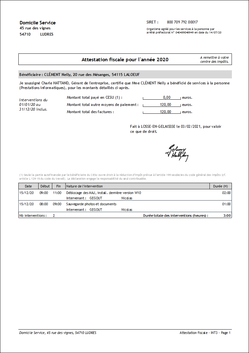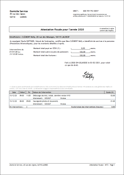 In France, companies in the personal services sector issue an annual tax certificate, which allows their clients to recover part of the sums paid, in the form of an income tax credit equal to 50% of expenses and in the limit of a ceiling.
