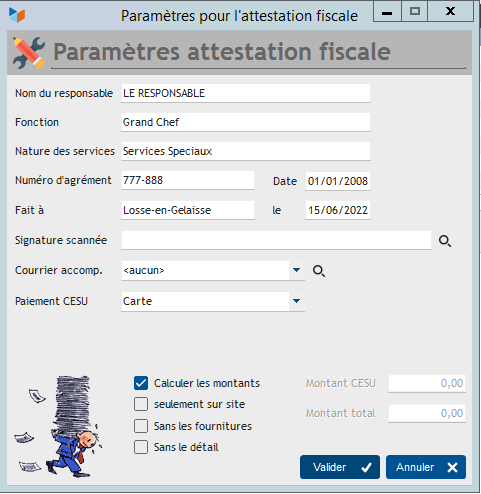 The Calculate amounts box allows you to calculate, or not, the amounts paid by the customer. They are calculated on the basis of entries recorded in payment of invoices issued within the specified date range. In case you request the certificate for a single customer, you can force amounts to any value of your choice.