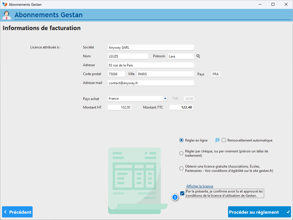 Then click on the Show license link to view the terms of the license agreement. This has the effect of checking the 3 box, which allows you to continue the payment process by clicking on the Next button.