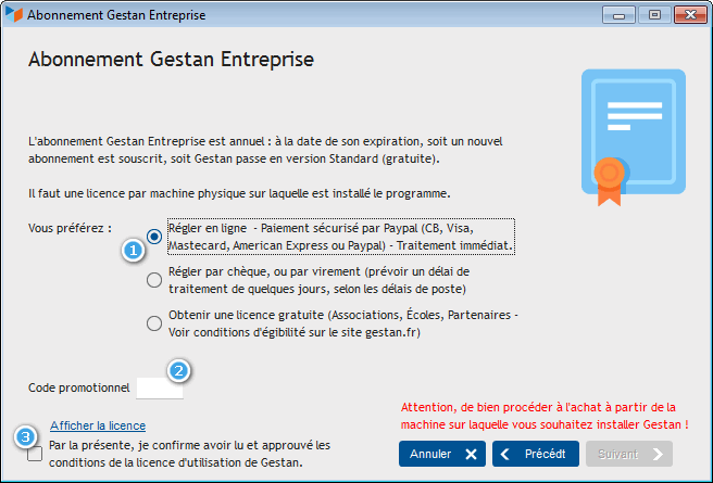 Access: Open the Gestan software, then use the menu? → Gestan Entreprise → Buy a license.