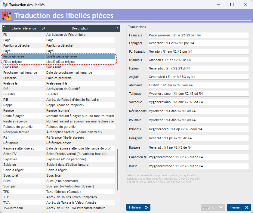 • Generated part: controls the wording inserted in the source part notes when you generate one part from another. The default wording in French is: “Pièce générée : %1 le %2 %3 par %4”. If, for example, you generate a delivery note ID7 from a customer invoice, this will insert a note: Pièce générée : BLV7 le 26/06/24 05:16 par EN in the invoice notes. The %1 label will be replaced by the part type and ID, %2 by the generation date, %3 by the generation time, and %4 by the generation user code.