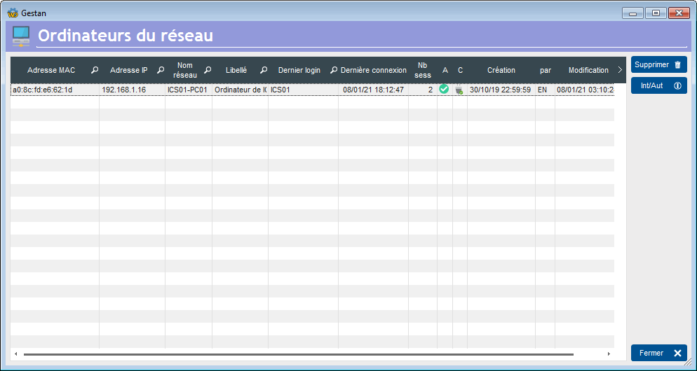 The Int/Aut button allows you to manage connection authorizations by MAC address: you can prohibit or authorize each machine on the network to connect to the Gestan database. Column A indicates the connection authorization status for the MAC address in question.