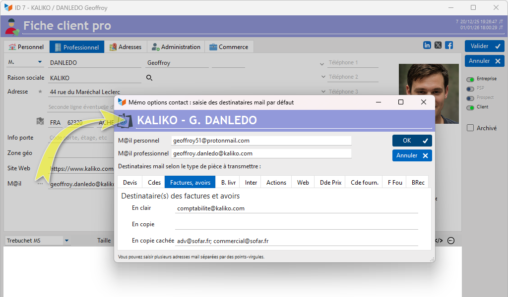 A contact can have a personal and/or professional email address, without prejudging the fact that certain documents must be transmitted to other email addresses. This screen is used to declare them.
