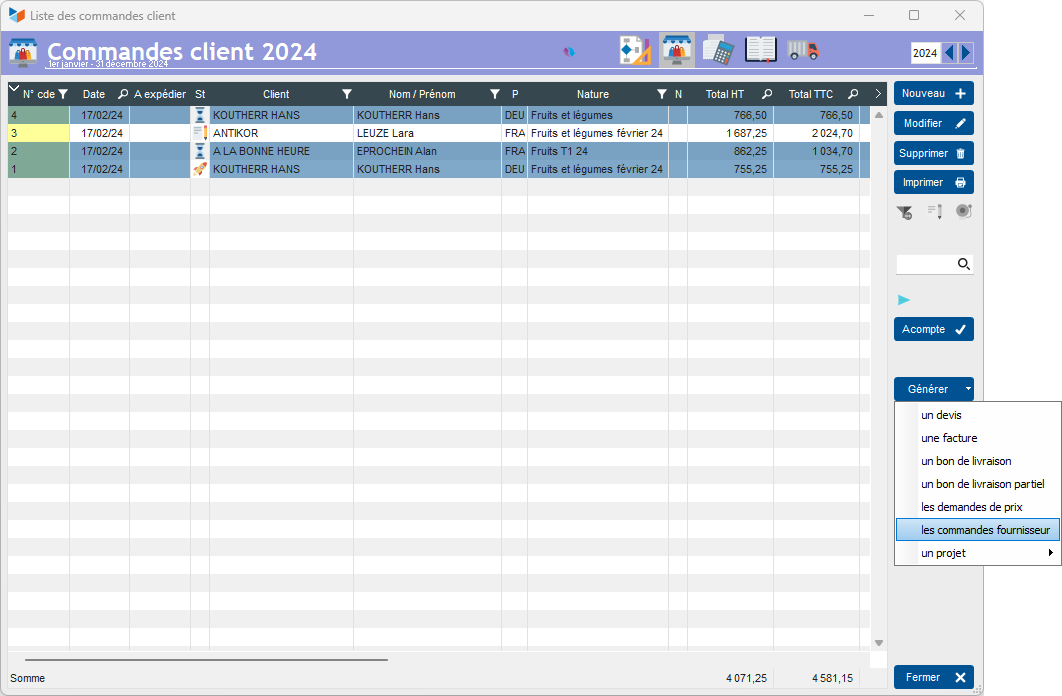 In the “Nature” area of the generated supplier orders there will be a label such as “CC supplies order [3, 6]”, for example, if the original customer orders are orders 3 and 6. If the box Nature identical is checked, the nature will be that of the first customer order.