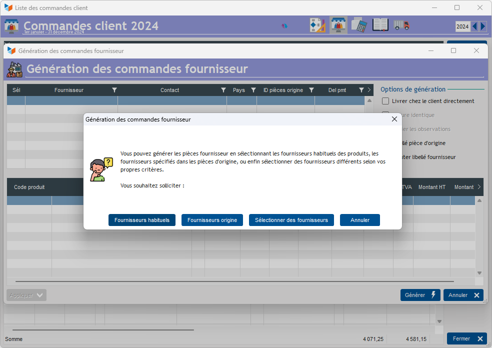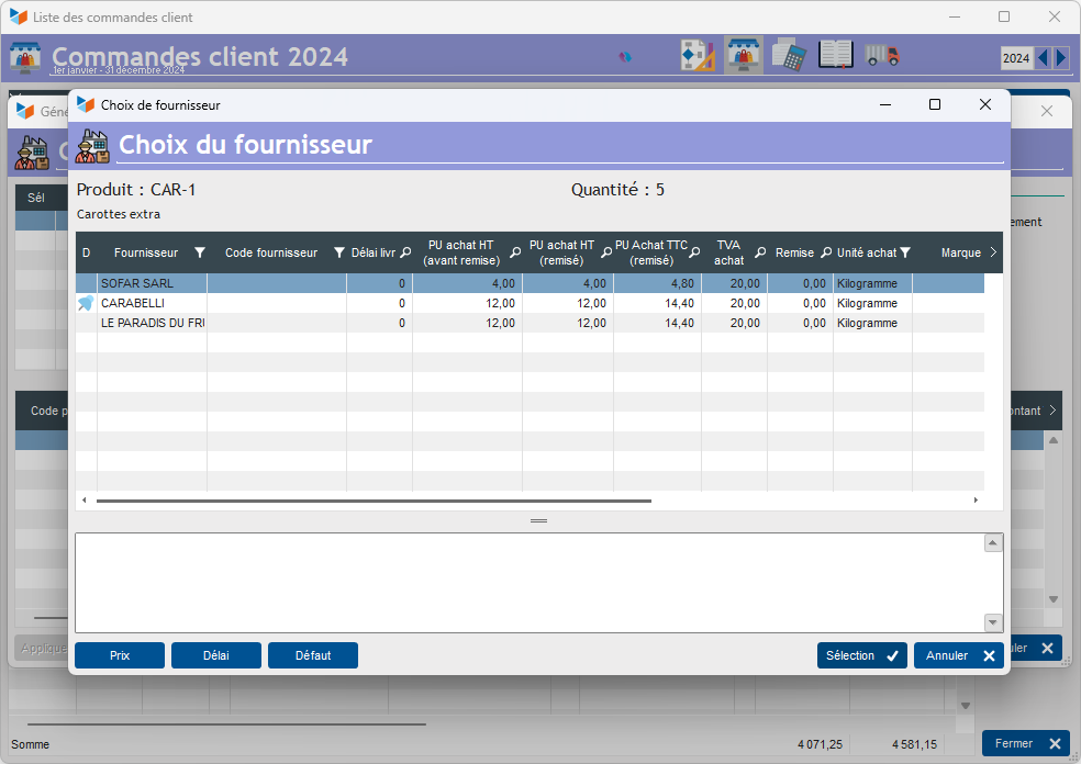 The usual suppliers: Gestan will search for the default suppliers of the products appearing in the sales order selection.