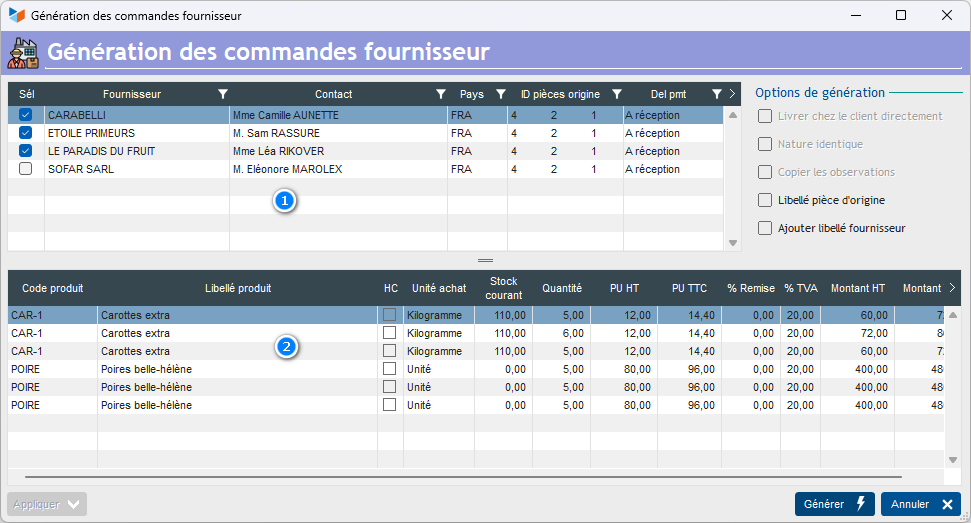 Select suppliers: Gestan will offer you, for each product, to choose the supplier from whom you wish to purchase, via the supplier selection screen below.