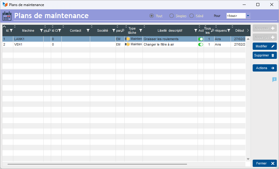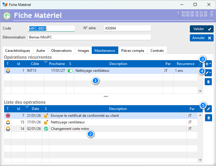 The upper part of the screen 1 presents recurring maintenance operations, while the lower part 2 presents the operations carried out or to be carried out: one-off operations, plus operations recurring.