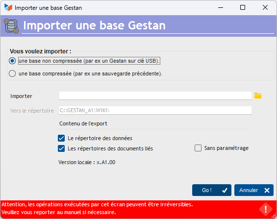 - to import data from removable media such as a USB key. In this case, the files in the DATABASE and DOCUMENTS directories of the source directory are automatically copied to the directories of the target directory.