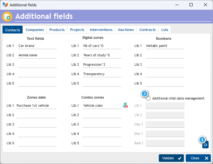 In the particular case of the contacts file, it is also possible to manage configurable fields for children, to do this you must check box 2.