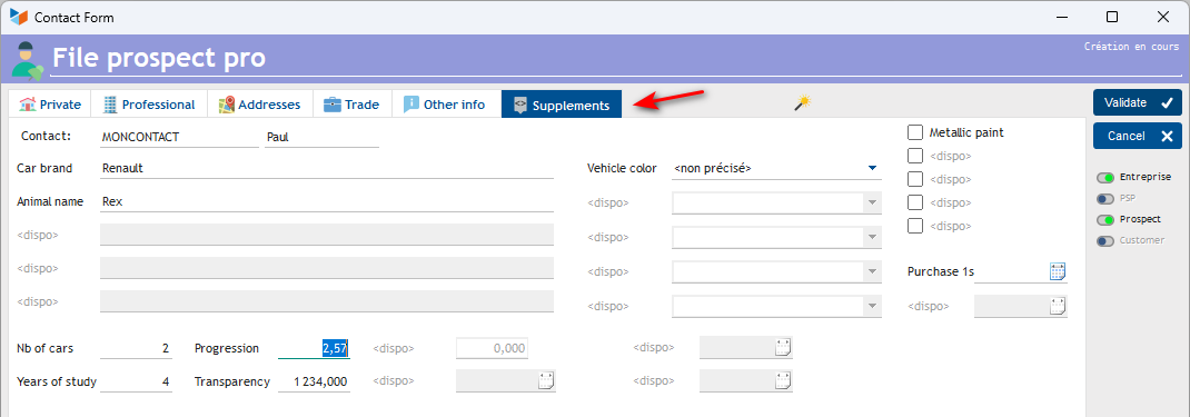 For the major Gestan files (contacts, products, machines, etc.), it is possible to manage specific additional fields.