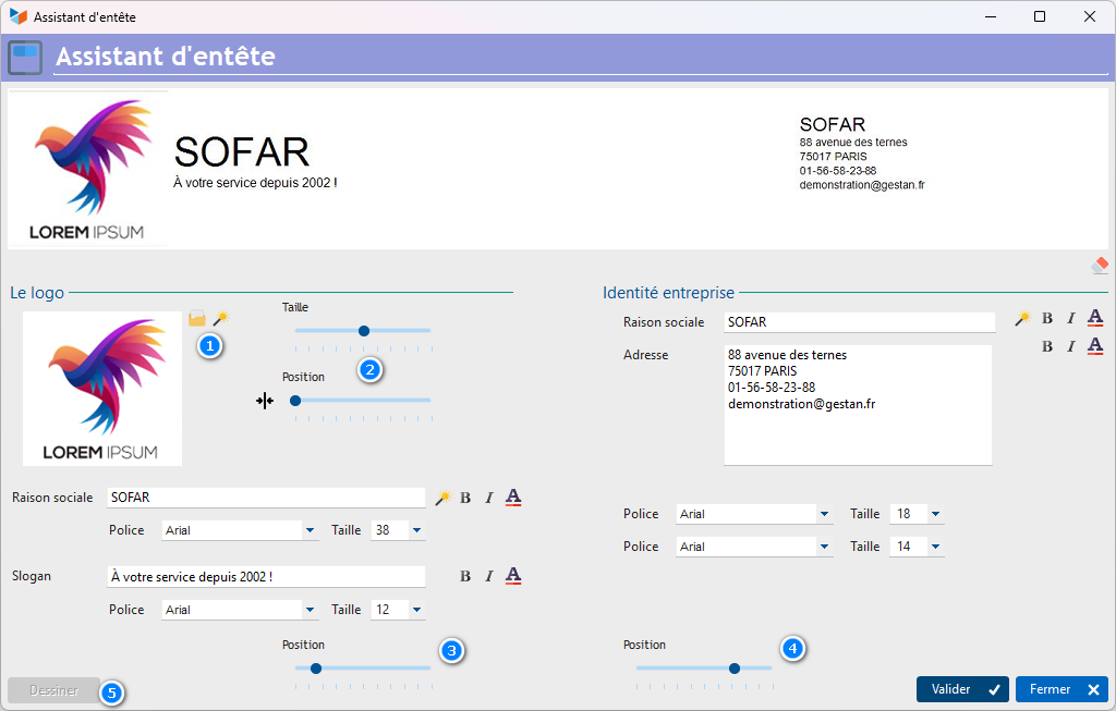The header creation wizard helps you create images adapted to the headers used by Gestan in quotes, invoices, intervention sheets, etc.