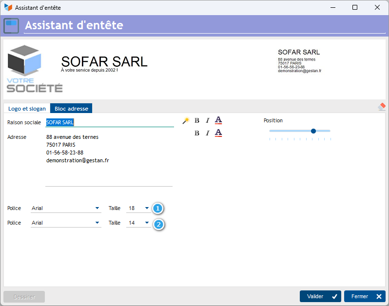 This pane allows you to position an address block in the logo. You can set the font and font size for the company name and identification elements, via the 1 and 2 controls.