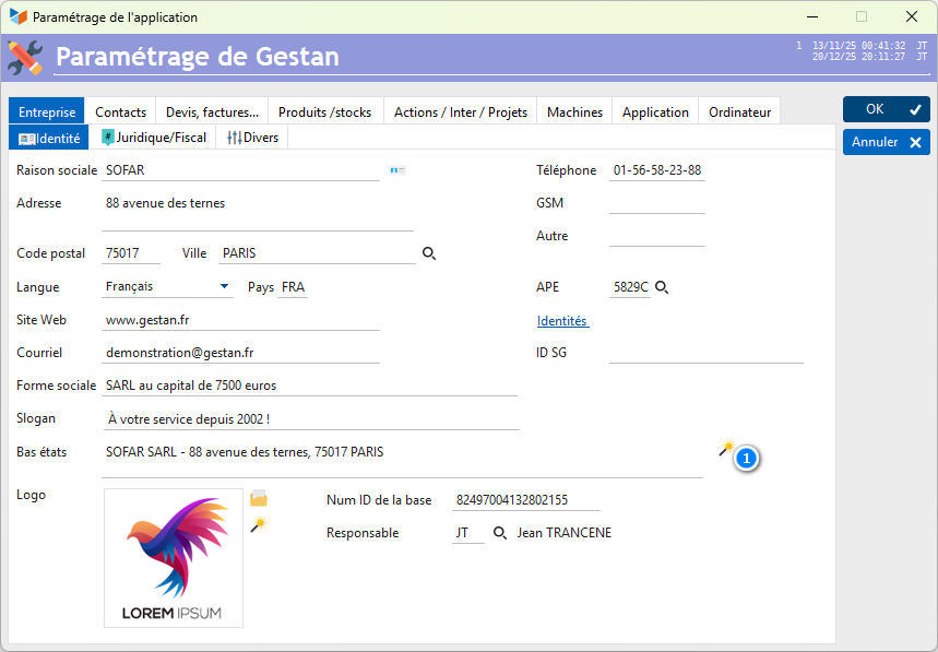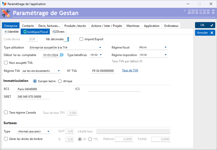 In this tab of the general settings, the elements which concern the company as such are grouped: address, tax regime, SIRET identification, etc.