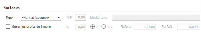 Manage stamp duties: allows you to print the amount of any stamp duties at the bottom of the invoice. If this box is checked, the calculation method can be specified via the %, HT/TTC, Ceiling and Package fields.