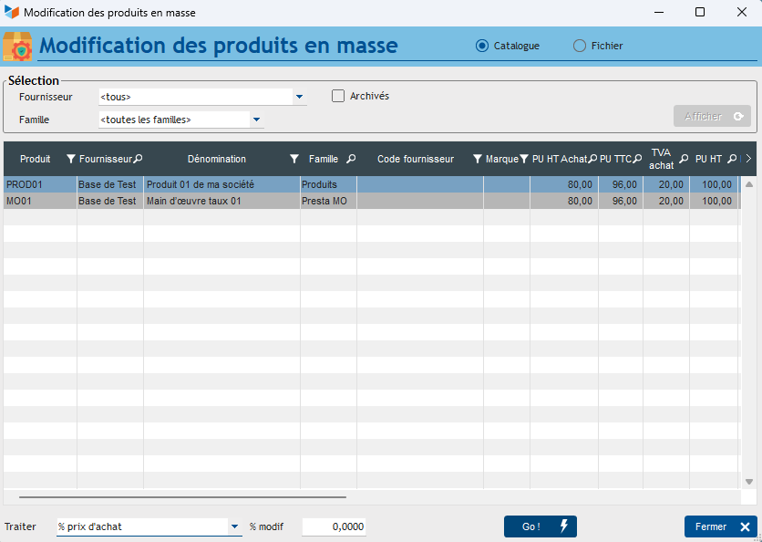 The upper part of the screen (Selection) allows you to select the products you wish to modify, by supplier, family, and possibly sub-family, taking into account, or not, the archived products.