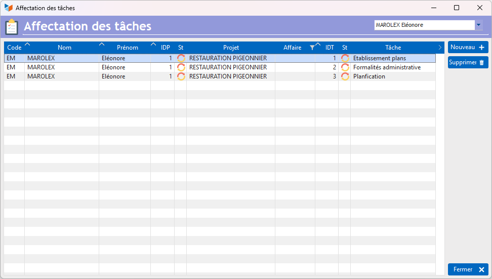 - Project selection: allows you to select a project and display all assignments to this project. The New button allows you to select a user to assign them to this project.