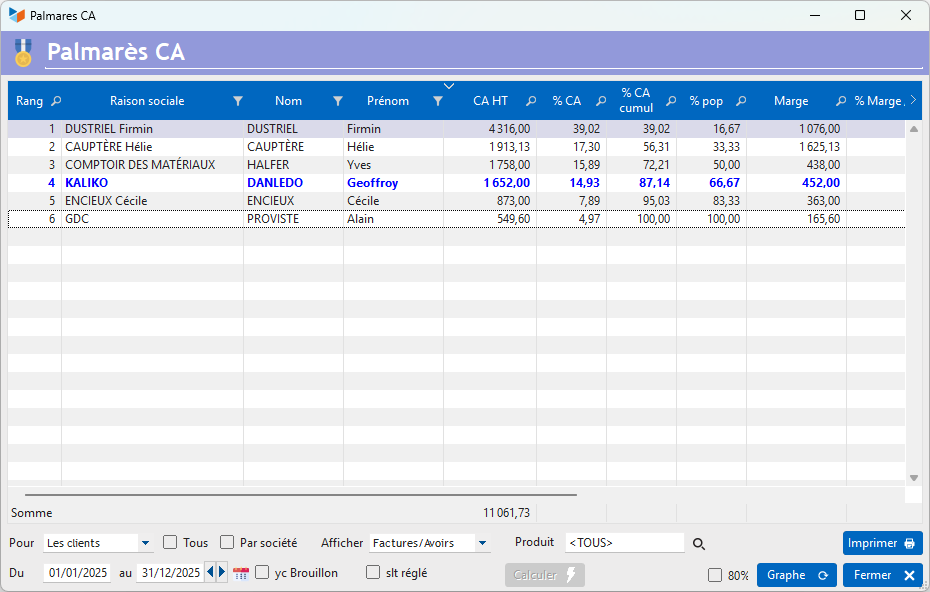 The Rankings screen presents the list of the best customers (evaluated according to their purchasing volumes), or the best suppliers (evaluated according to the volumes of supplies).