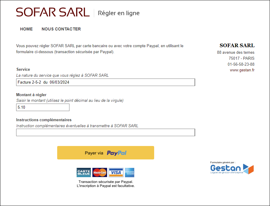 The payment link integrated into the PDF will open a payment form in your colors, hosted on gestan.fr. The payment button will then open the Paypal form.