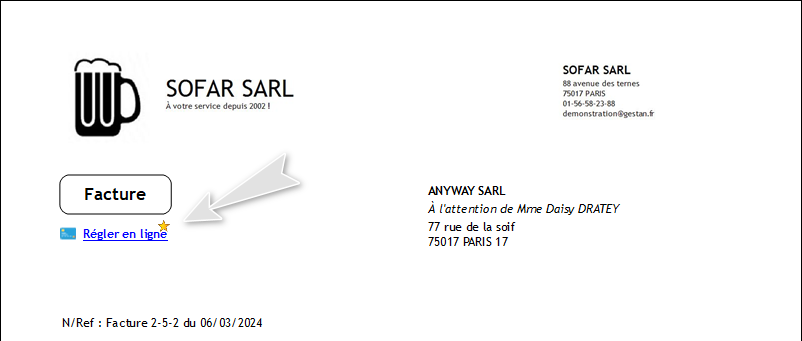 It is possible to integrate an online payment link into invoices produced by Gestan. The payment link will be integrated into the PDF of the invoice: your customer can click on the link and pay your invoice directly by credit card or Paypal.