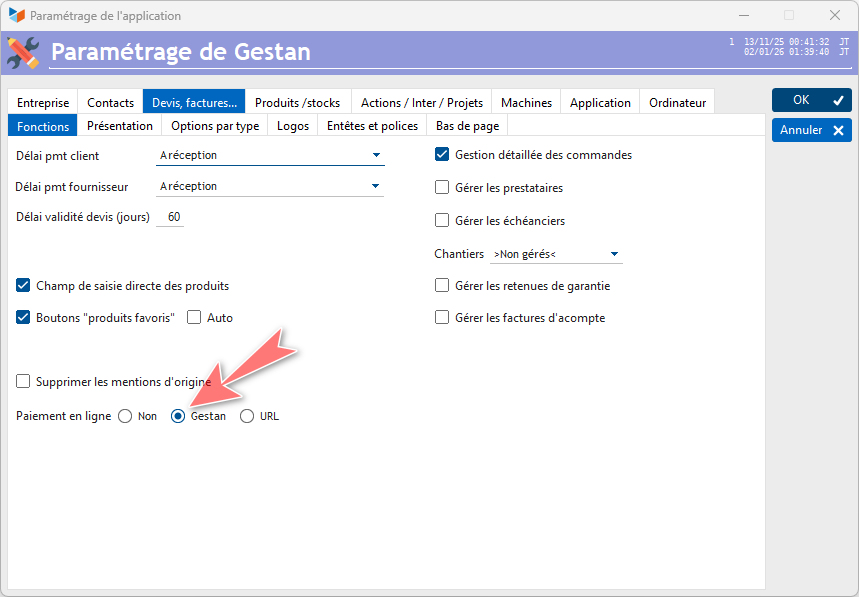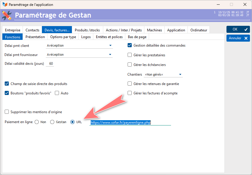 Simply choose the “via gestan.fr” option in the “payment link” option in the Parts → Other options tab.
