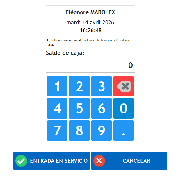 - el botón Servicio permite iniciar un servicio, a través de la pantalla de introducción del fondo de caja, que precede a la pantalla principal de introducción de datos de la caja táctil