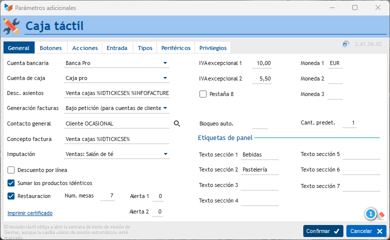 Las casillas IVA excepcional 1 y 2 permiten guardar tipos de IVA excepcionales que luego podrá aplicar fácilmente a todo o parte del ticket de caja, si procede. Por ejemplo, usted tiene una tetería. Vende principalmente dulces para consumir en el local (IVA al 5,5 %), pero también algunos productos de alimentación para llevar (IVA al 10 %) y bebidas alcohólicas (IVA al 20 %). En Gestan, configure un tipo por defecto del 5,5 %. A continuación, declare los tipos del 10 % y del 20 % como tipos excepcionales. Por defecto, sus tickets de caja se emitirán con un IVA del 5,5 %, salvo en las líneas que usted designe, a las que podrá aplicar un tipo excepcional del 10 % o del 20 %.