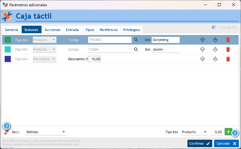 El botón 1 permite añadir un producto o un descuento, según la posición del menú desplegable Tipo de botón.