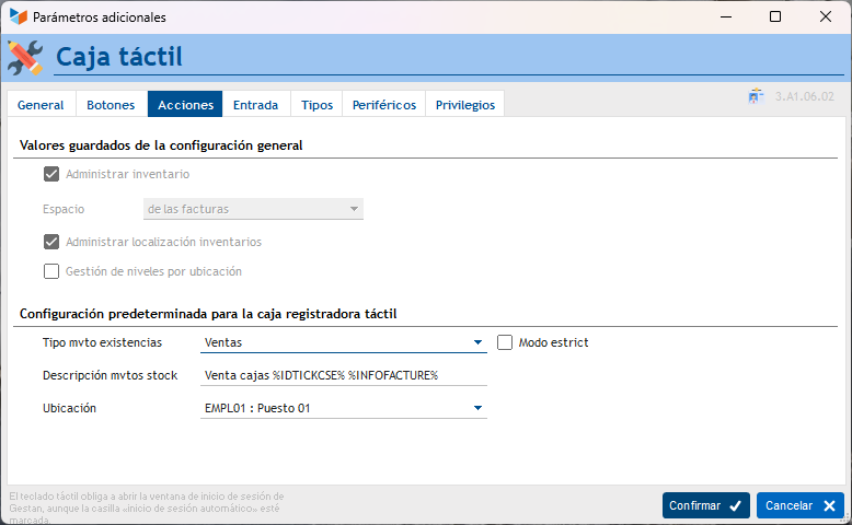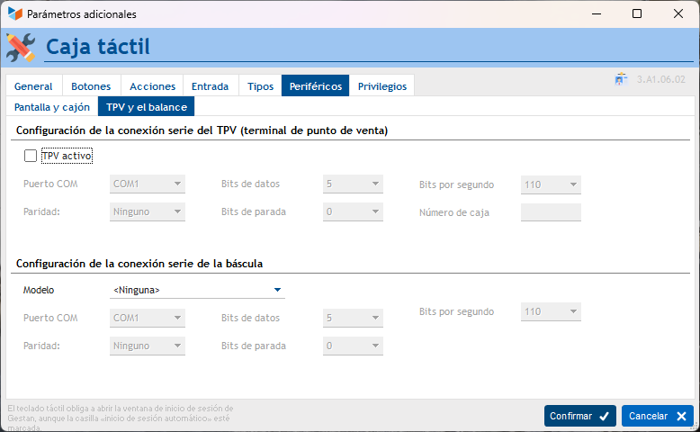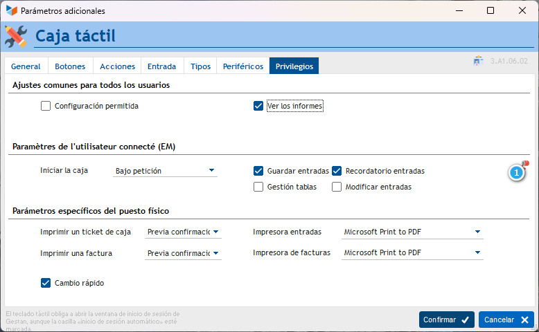 En esta pantalla, la casilla Configuración permitida permite que todos los usuarios puedan acceder a la configuración desde la pantalla de inicio de la caja registradora táctil: marque esta casilla al principio, cuando instale la caja registradora en los distintos puestos de su empresa; a continuación, realice la configuración en todos los puestos y, por último, desmarque esta casilla: solo los administradores de Gestan tendrán acceso a la configuración.