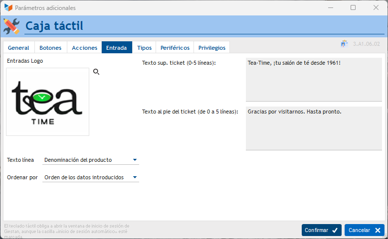 La casilla Configuración autorizada permite que todos los usuarios puedan acceder a la configuración desde la pantalla de inicio de la caja registradora táctil: marque esta casilla al principio, cuando instale la caja registradora en los distintos puestos de su empresa, luego realice la configuración en todos los puestos y, por último, desmarque esta casilla: solo los administradores de Gestan tendrán acceso a la configuración.