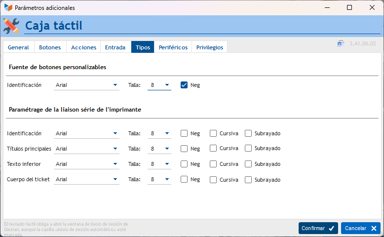 Esta pestaña permite configurar las fuentes de los botones de la caja táctil y las que se utilizan en el ticket de caja.