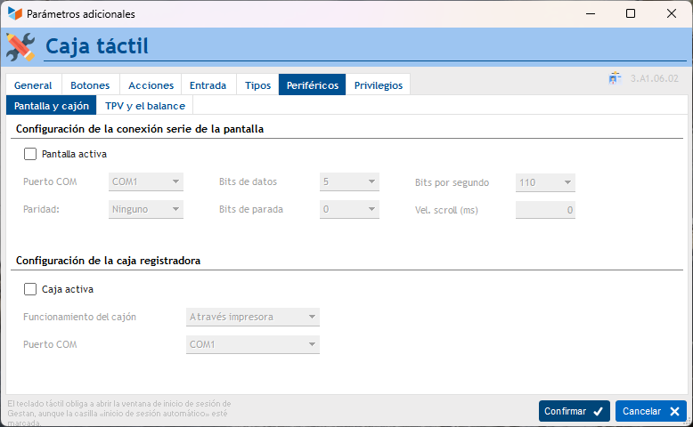 Pestaña «Periféricos, pantalla y cajón de caja»
