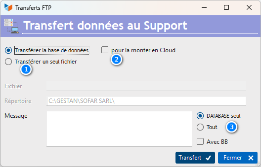 Cuando desee transferir los datos de su base de datos a la Nube, simplemente seleccione las opciones 1 y 2, luego haga clic en el botón Transferir 3.