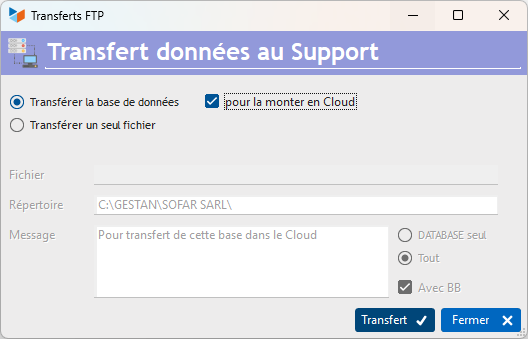 Comprima todo el directorio de datos de su máquina (en nuestro ejemplo C:\GESTAN\MY COMPANY\ con sus subdirectorios BASE DE DATOS, DOCUMENTOS, BACKUPS, RECURSOS) y envíe la carpeta comprimida a través de www.swisstransfer.com a la dirección cloud@gestan.fr .