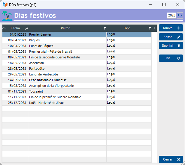 El botón Inicializar permite inicializar los días festivos del año seleccionado.