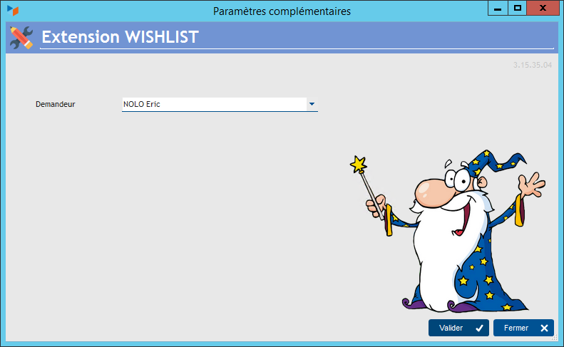 Après installation, l'écran de paramétrage permet de sélectionner l'utilisateur qui est responsable des services généraux.