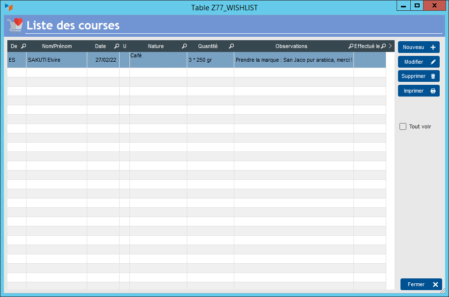 Cette extension permet de gérer une liste de courses : les utilisateurs peuvent exprimer leurs souhaits auprès du responsable des services généraux, qui peut ainsi organiser ses achats.