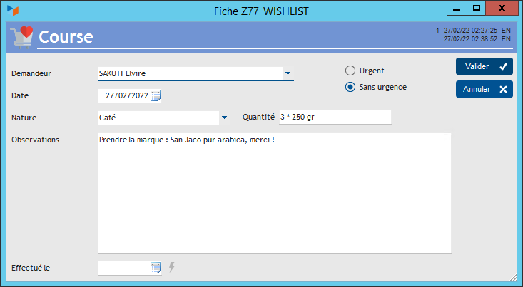 La zone Effectué le ne peut être renseignée que par le responsable des achats, désigné dans le paramétrage de l'extension.