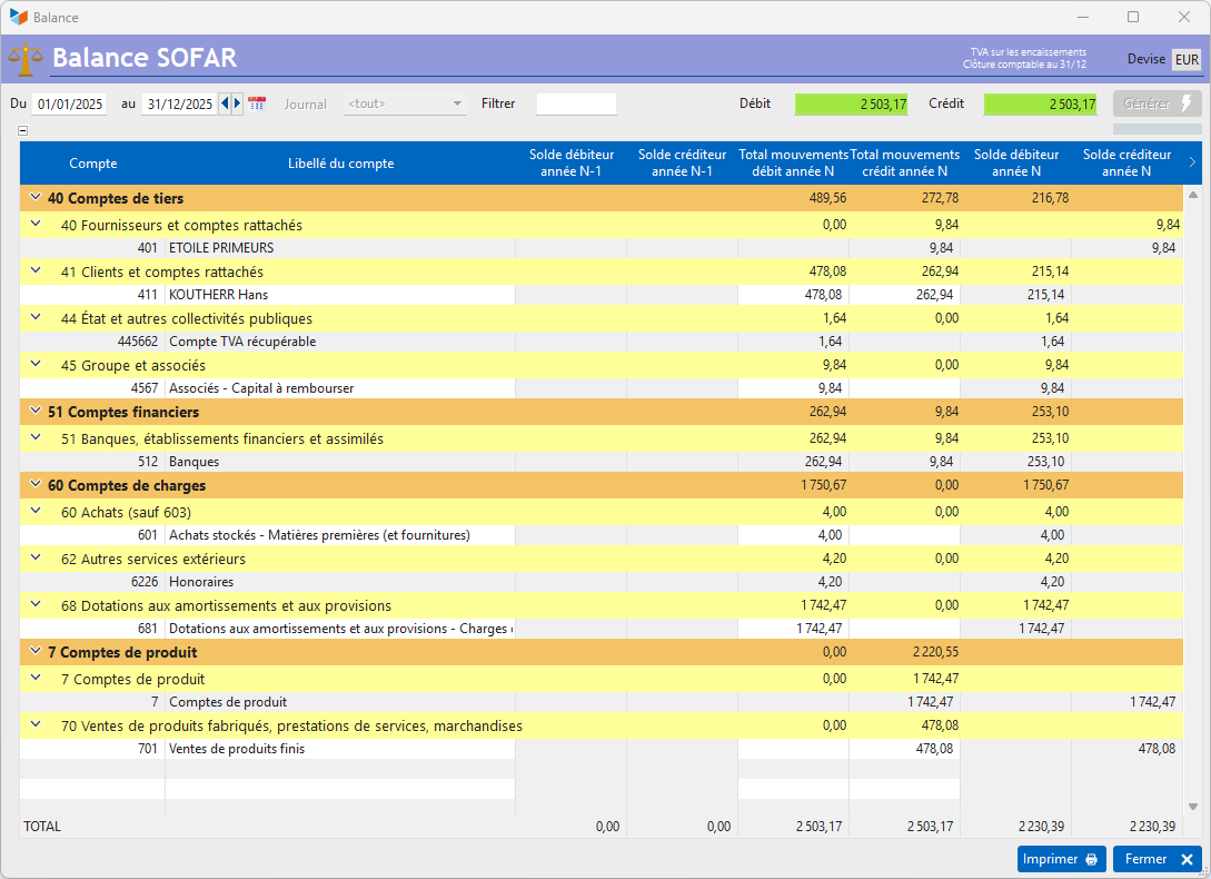 Cet écran présente la balance comptable, pour tout ou partie de l'exercice.