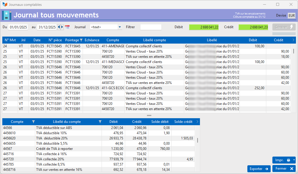 Le bouton Imprimer génère l'état ECR13, tandis que le bouton Exporter génère deux fichiers Excel des journaux (détail et totalisation).