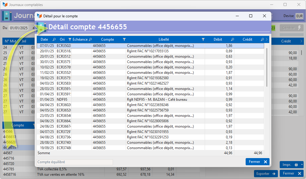 Un double clic sur cette table ouvre le détail du compte, écran ci-dessous.