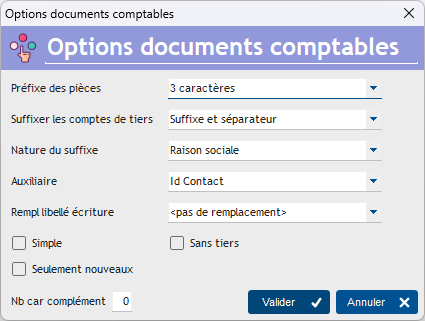 Nb car complément sert à compléter éventuellement les numéros de compte par des zéros, jusqu'à la taille demandée. Ainsi, si vous indiquez “8” dans ce champs, le compte 411 sera présenté sur 8 caractères, sous la forme 41100000.