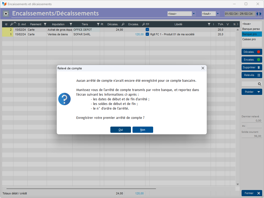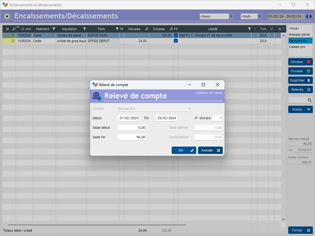 La date de fin est indiquée sur le relevé de votre banque. Le solde de fin, si nous avions un solde précédent à 0, est maintenant de 120-24, soit 96.
