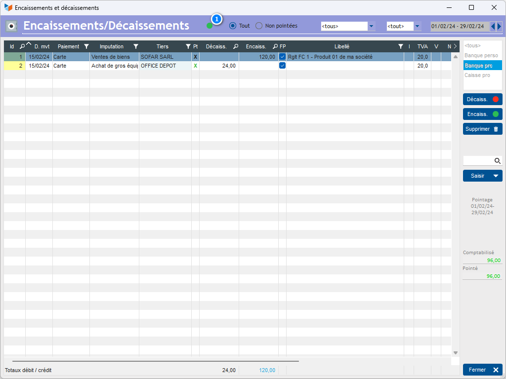 Supposons que vous débutez votre activité en février : vous avez reçu sur votre compte le paiement d'une facture de 120, et acheté pour 24 de fournitures.