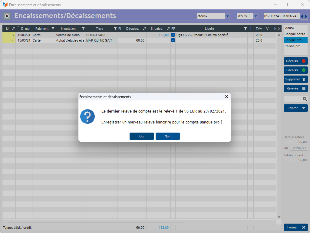 Repassant en mode pointage, Gestan vous proposera d'enregistrer votre second relevé de compte.