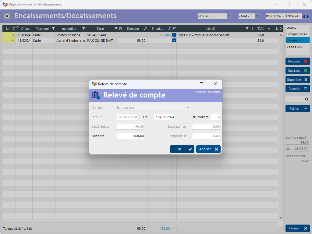 La création d'un relevé de compte est effectuée depuis l'écran des écritures (utilisation en mode pointage).