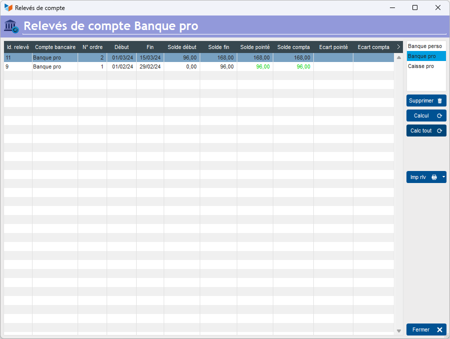 Une fois le pointage de vos écritures terminé, le bouton Relevés de la liste des écritures ouvre la liste des arrêtés de comptes bancaires.